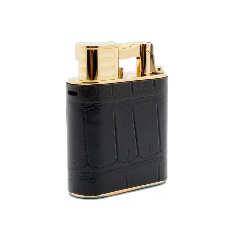 Dunhill The White Spot Unique Turbo Alligator Piezoelectric Lighter, made in Gold-Plated Brass covered with Alligator texture leather, Jet flame, Engraving of Dunhill logo on the base of the lighter. Color: Gold and Alligator Black.