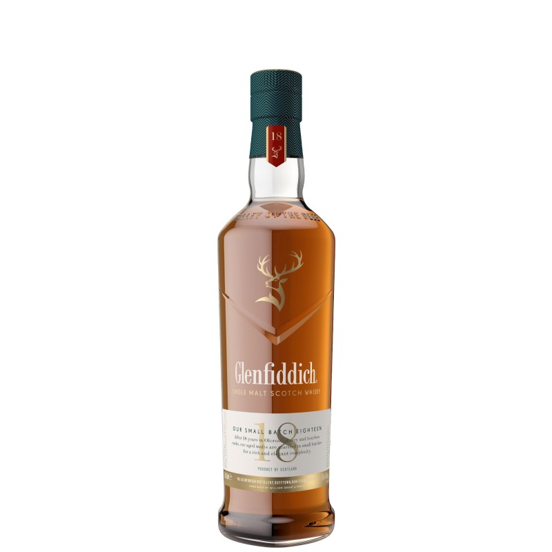 Glenfiddich 18 Y.O. is distilled in two differently shaped stills. Because of the difference in the shape of the still's neck, two different expressions are obtained, which are then combined to give rise to Glenfiddich's distinctive taste. New Make is reduced to 63.5% alcohol in American oak and ex-sherry casks, using water from the Robbie Dhu spring. It is aged for a minimum of 18 years and bottled after the malt master, Brian Kinsman, carefully selects the best barrels.
