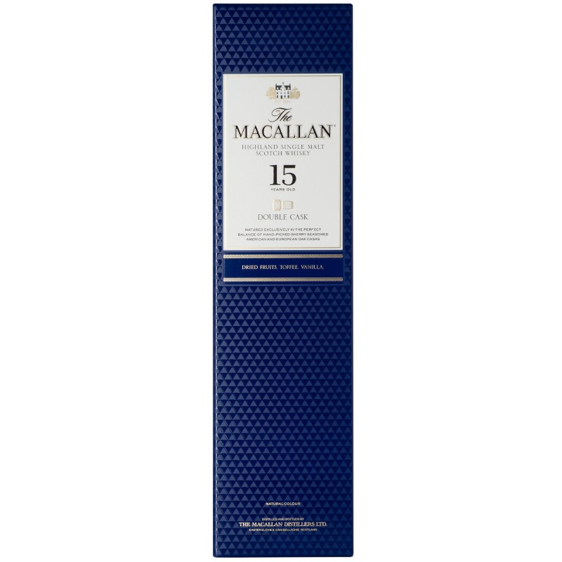 The Macallan 15-Year-Old Double Cask is a whiskey. Aged in a combination of American and European oak casks before being blended with Oloroso ex-sherry casks. The 15 year old's fruity and citrus profile gives way to increasing complexity, notes of fruit in alcohol, and spices on the finish.