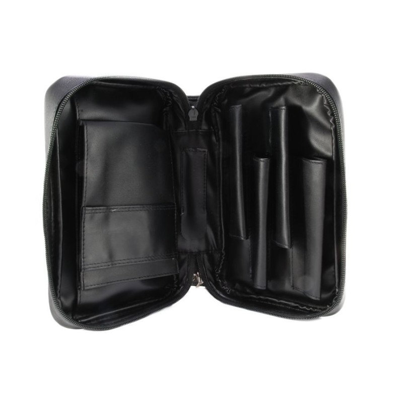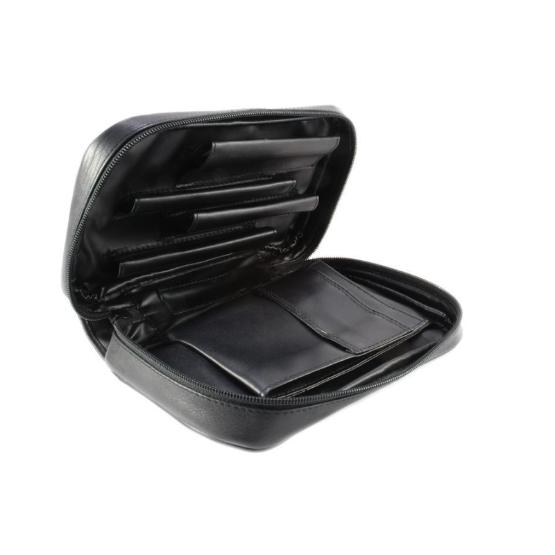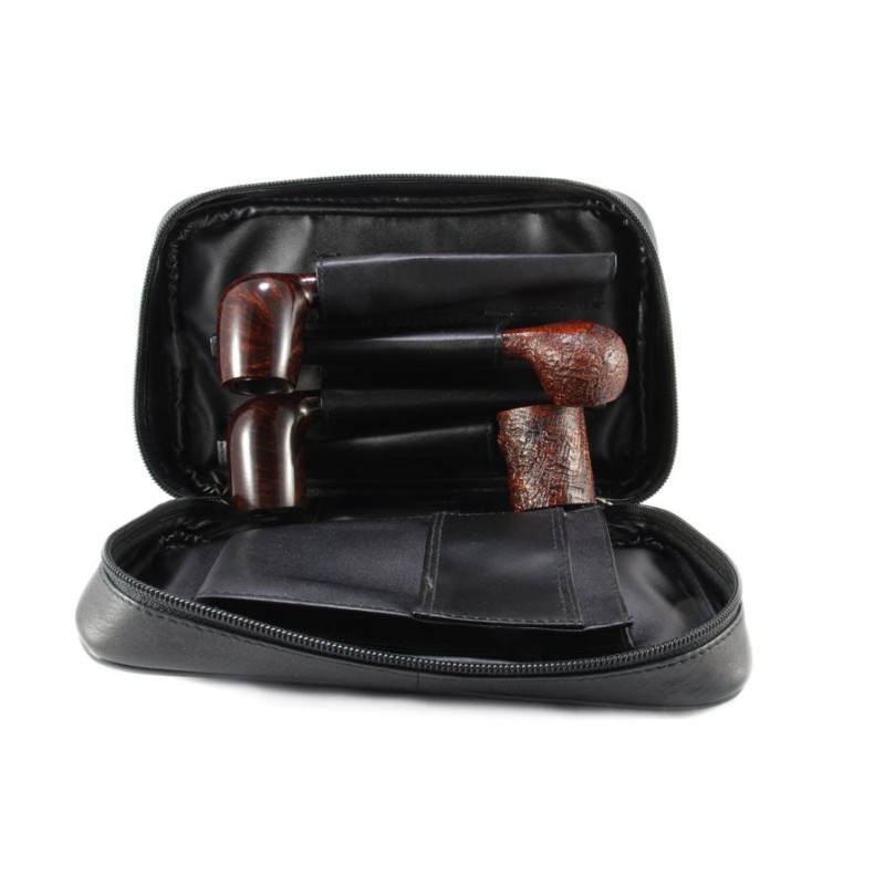 Pipe bag in leather with magnet button for 4 pipes , 1 zip, 1 pipe tamper holder, 3 pockets and 1 tobacco holder, color: black