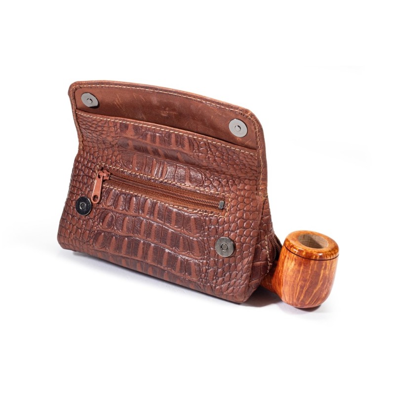 Pipe and tobacco bag in Veal leather for 1 pipe with buttons and anterior zip pocket for accessories holder, color: Crocodile Brown.