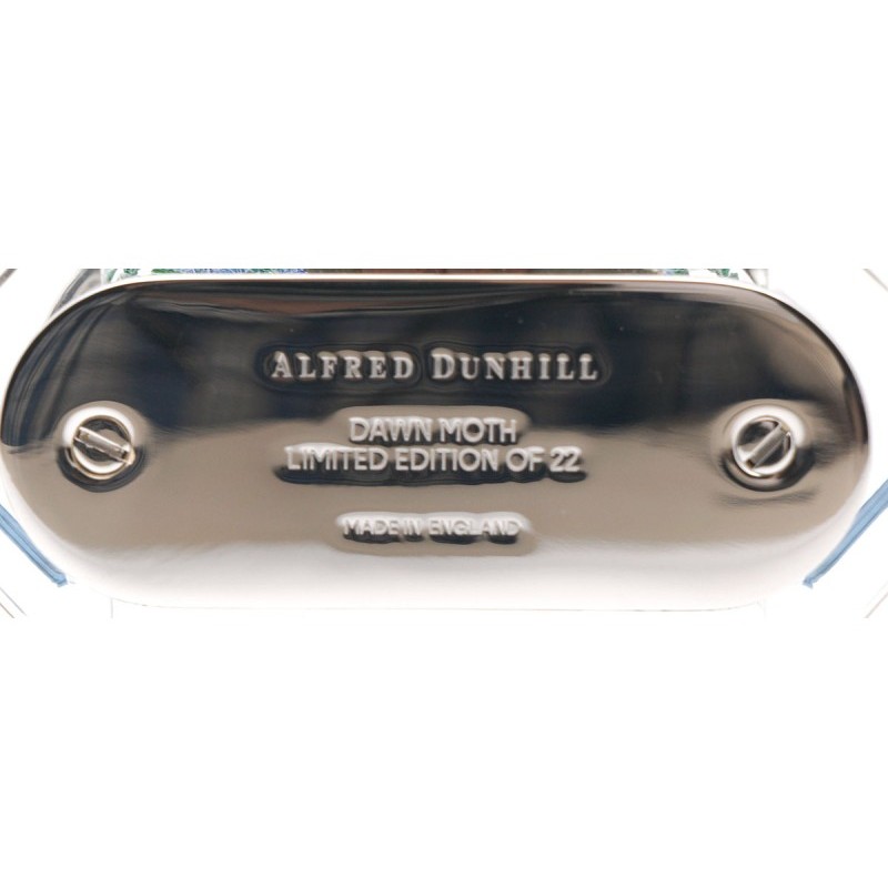 Accendino da Tavolo Dunhill The White Spot Unique Turbo Aquarium Moth Piezoelettrico, dipinto a mano, dettagli placcati in Palladio con incisione trama seta Moirè, Jet Flame, incisione logo Dunhill sulla base dell'Accendino, edizione limitata a 22 pezzi.