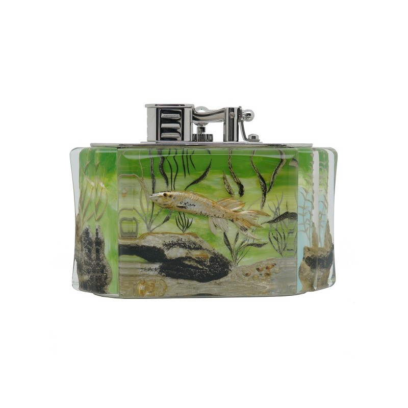 Accendino Dunhill The White Spot Unique Turbo Aquarium Fish Green Piezoelettrico, dipinto a mano, realizzato in Ottone e Palladio Spazzolato con incisione trama Rollagas, Jet Flame, incisione logo Dunhill sulla base dell'accendino, edizione limitata a 22 pezzi.
