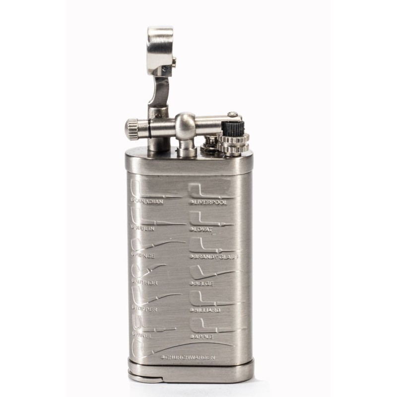 Accendino per Pipa Passatore "Pipette", Pietrina a Fiamma Dolce, Colore: Cromo con le incisioni degli shape della pipa, scatola originale.
