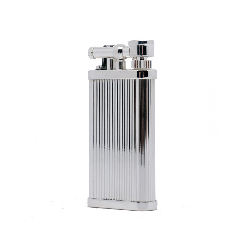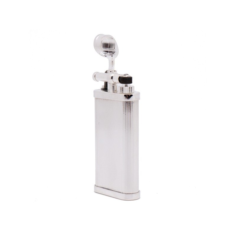 Accendino per Pipa Dunhill The White Spot Unique Lines a pietrina, realizzato in Ottone e Placcato in Argento con incisione trama Linee, Fiamma dolce, incisione logo Dunhill al lato dell'Accendino per Pipa, Colore: Argento.