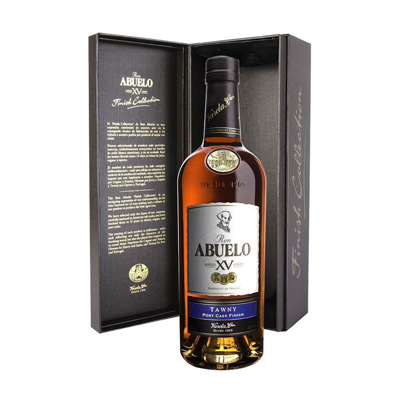 Il Ron Abuelo XV Tawny è uno dei tre prodotti della Finish Collection. La capacità di valutare l'impatto della finitura in diverse botti è unica per questa gamma. La miscela di partenza per tutti e tre è la stessa, cioè rum invecchiati in botti ex-bourbon per una media ponderata di 14 anni. La finitura avviene per un anno in tre diverse botti: porto, sherry e cognac. Il finale, in questo caso, è in botti di Porto Tawny.