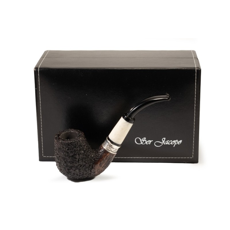 Ser Jacopo Historica 2026 Picta Picasso 11 Rusticata R1, Pipa N°28, Colore: Nero, Vera elaborata in Argento con incisione "Ser Jacopo", inserto in Galalite sul bocchino, bocchino a sella, senza filtro, scatola e sacchetto originale, Made in Italy.