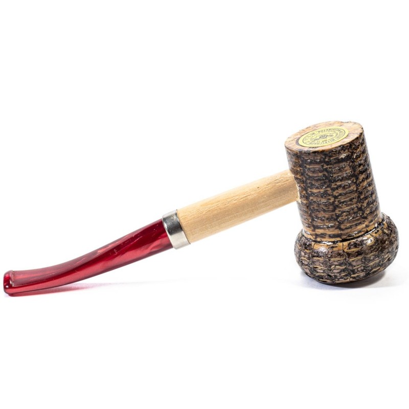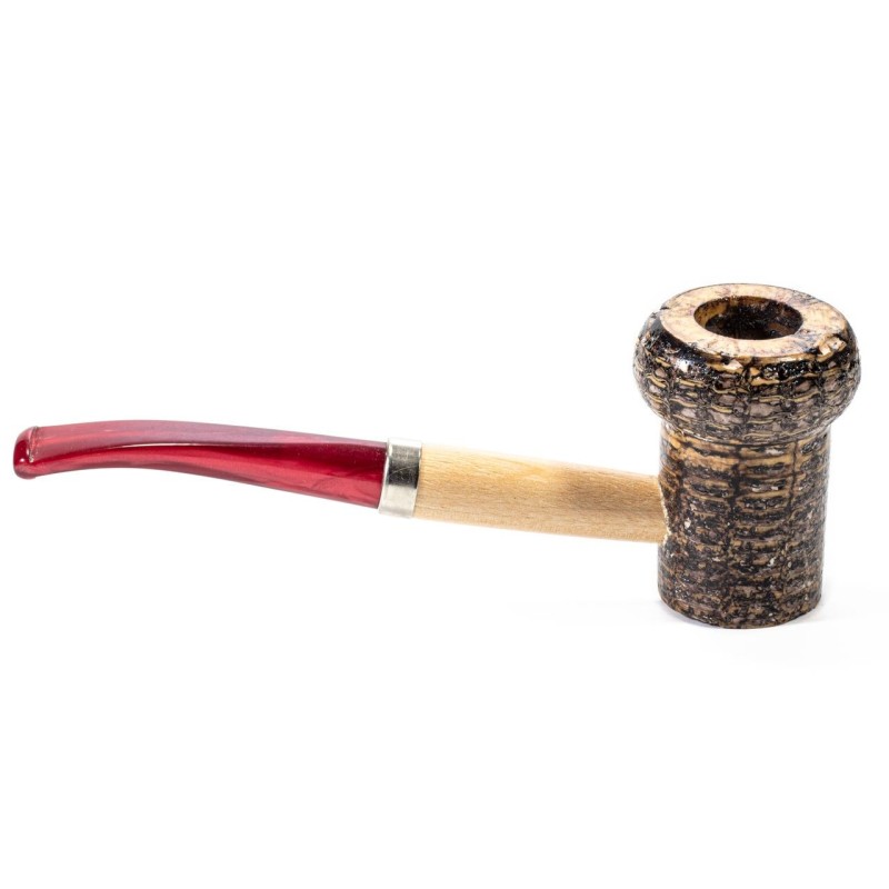 Si presenta con un fornello di medie dimensioni con alla base un inserto in legno, La pipa presenta una ghiera in Nichel e un bocchino in Metacrilato di colore Rosso.
