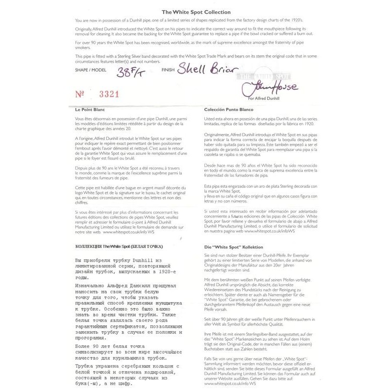 Dunhill The White Spot 38 F/T Shell Briar Sabbiata, Nº 3321, Anno 2021, Vera in Argento, bocchino a sella, senza filtro, Certificato di Garanzia e Autenticità, scatola originale.
