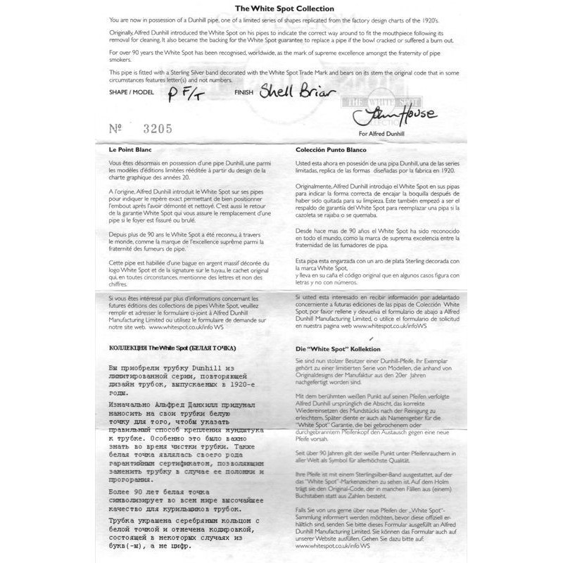 Dunhill The White Spot P F/T Shell Briar Sabbiata, Nº 3205, Anno 2021, Vera in Argento, senza filtro, Certificato di Garanzia e Autenticità, scatola originale.