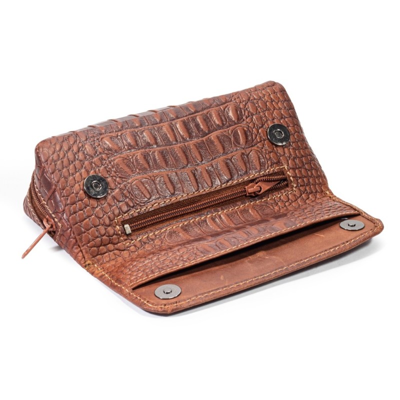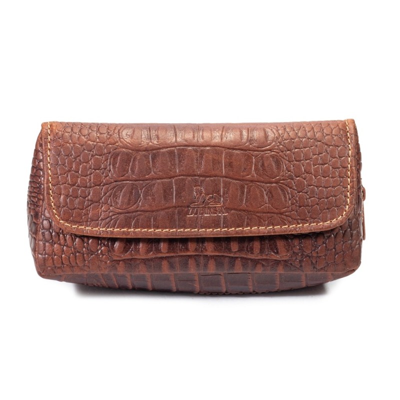 Borsa portapipa e tabacco in pelle di Vitello per 1 pipa a 2 bottoni con taschino anteriore a cerniera porta accessori. Colore: Trama di coccodrillo Marrone.