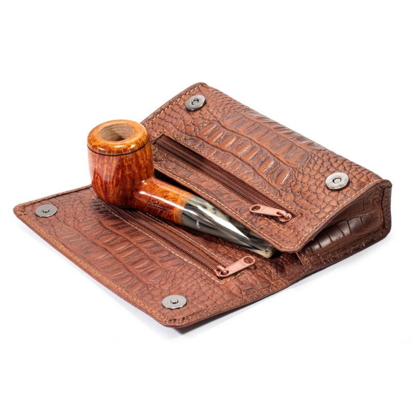 Borsa portapipa e tabacco in pelle di Vitello per 1 o 2 pipe con chiusura a bottoni con taschino anteriore e posteriore a cerniera porta accessori. Colore: Trama di coccodrillo Marrone.